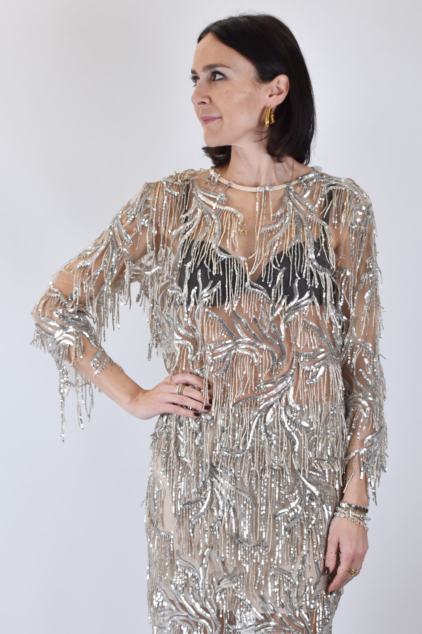 Pronta a brillare? Questo top in tulle trasparente con fili di paillettes applicati di Tensione In farà impazzire tutti! Scollatura a girocollo, bottoncino posteriore e maniche 3/4, vestibilità regolare