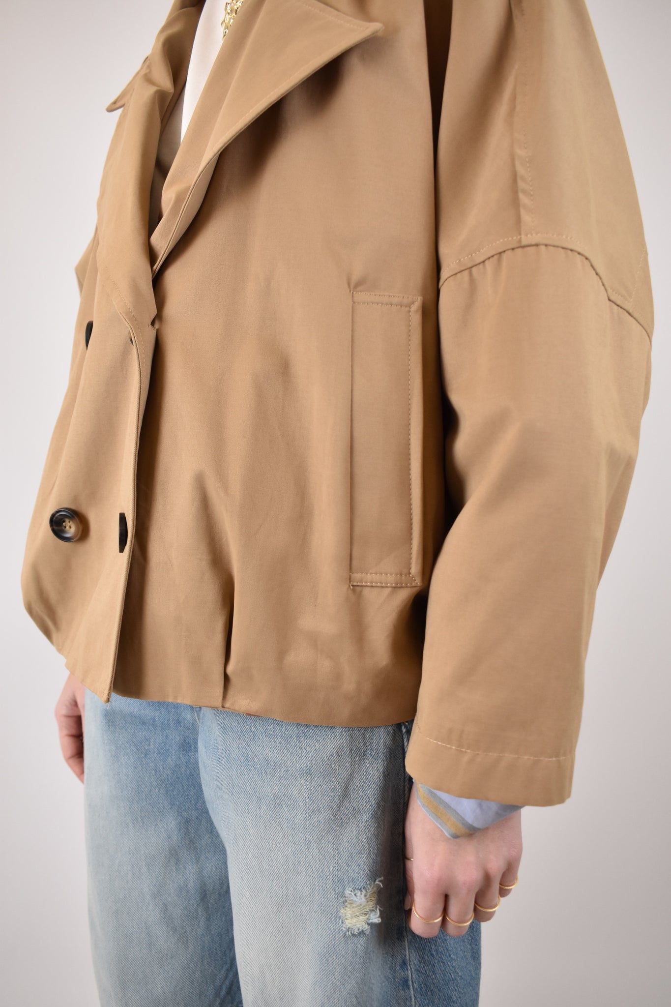 Trench corto in tessuto tecnico con chiusura doppiopetto, con spalla scesa e elastico posteriore per una vestibilità confortevole. Tasche laterali e arricciatura sul fondo. Un capospalla essenziale, unisce eleganza senza tempo e praticità moderna.